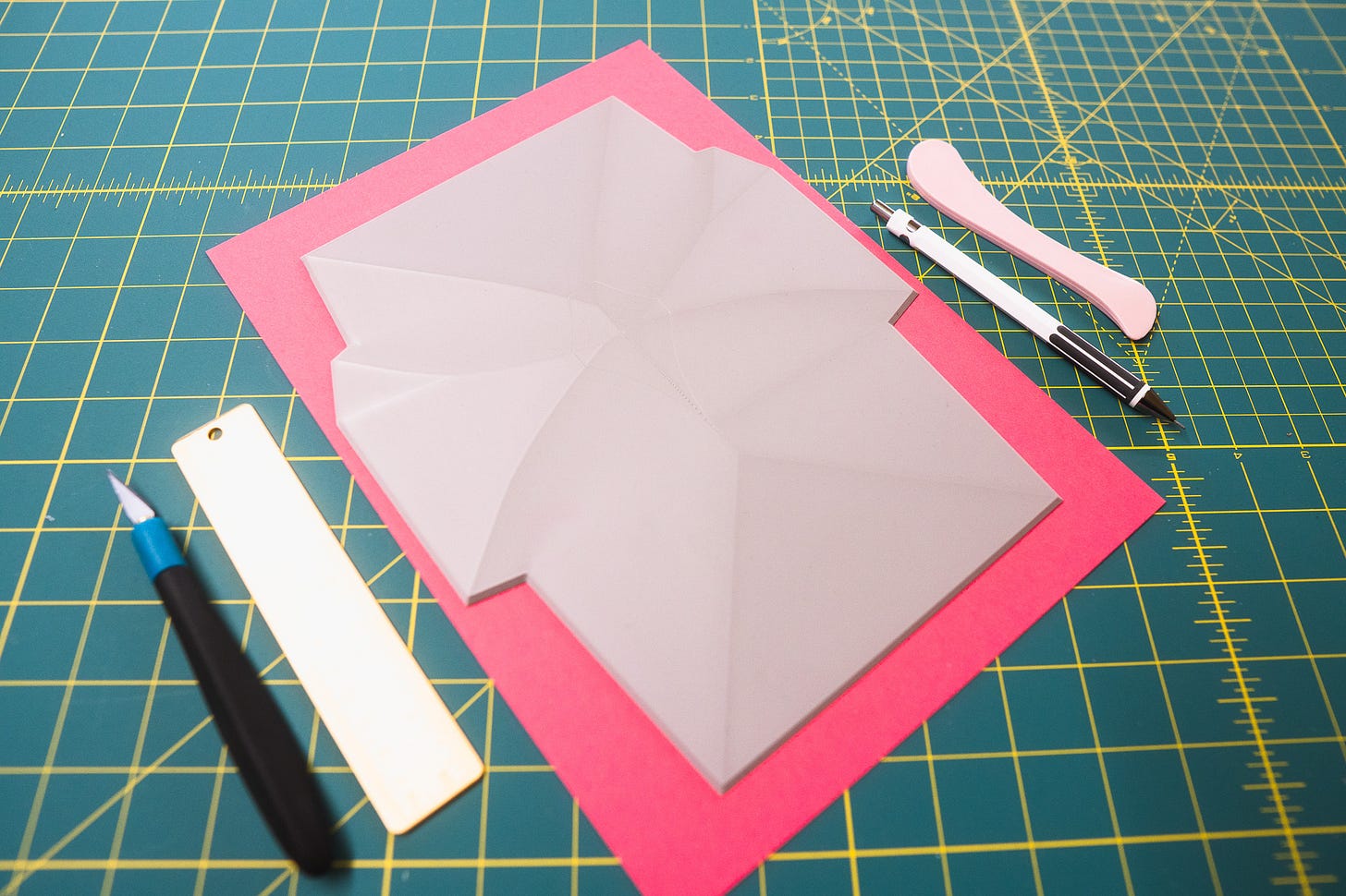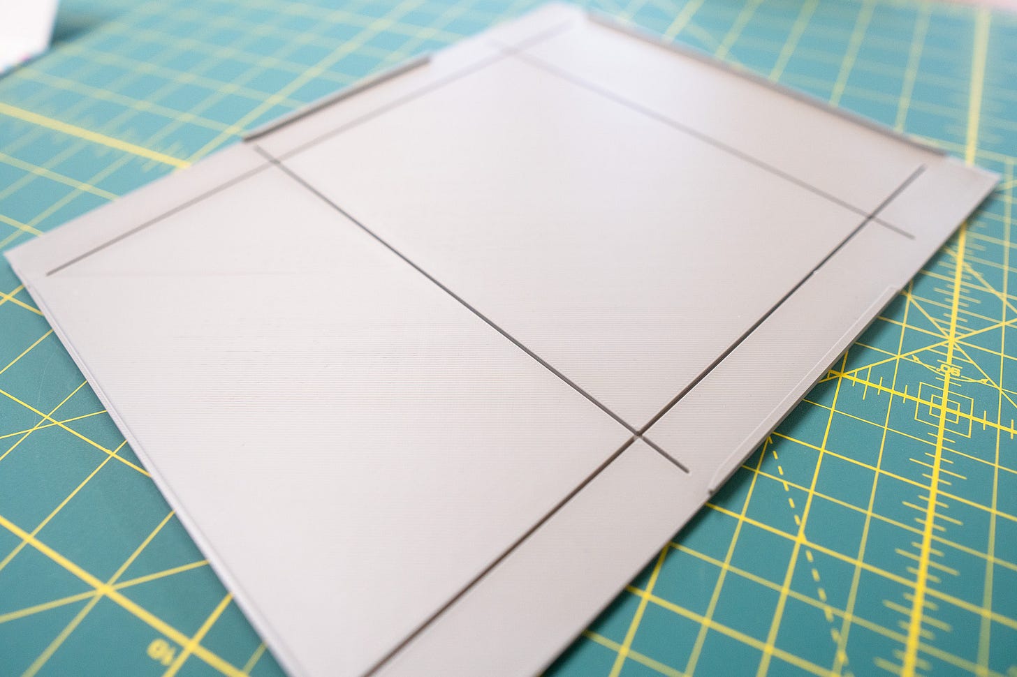 āCause itās best to make your envelope out of slightly thicker paper (maybe 140-170gsm) and thatās mildly inconvenient to fold if you have somehow lost ALL YOUR RULERS, I made a āscoring boardā to pair with the stencil, so once youāve cut out the envelope, if you havenāt completely screwed it up (ask me how I know), itāll fit nicely in the tray and you can easily score the folds in.