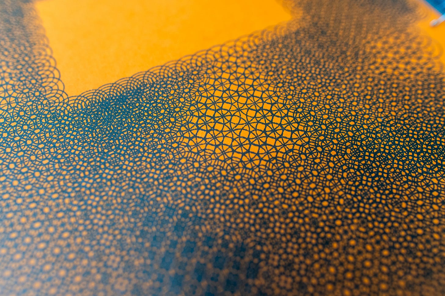 āHis work is not glamorous. In fact, his monoprints series was created using found metal objects taken from discarded car parts, disks, and other miscellaneous objects collected from the side of the road. He uses these objects to print ink on found paper. His methods are slow but very preciseāhe prints one colour per day, waits for it to dry, and prints the second colour the next day. By this method, Martensā prints may take days or weeks to be completedā - https://en.wikipedia.org/wiki/Karel_Martens