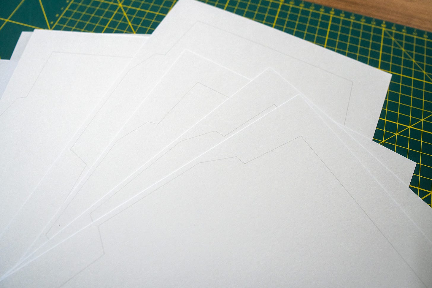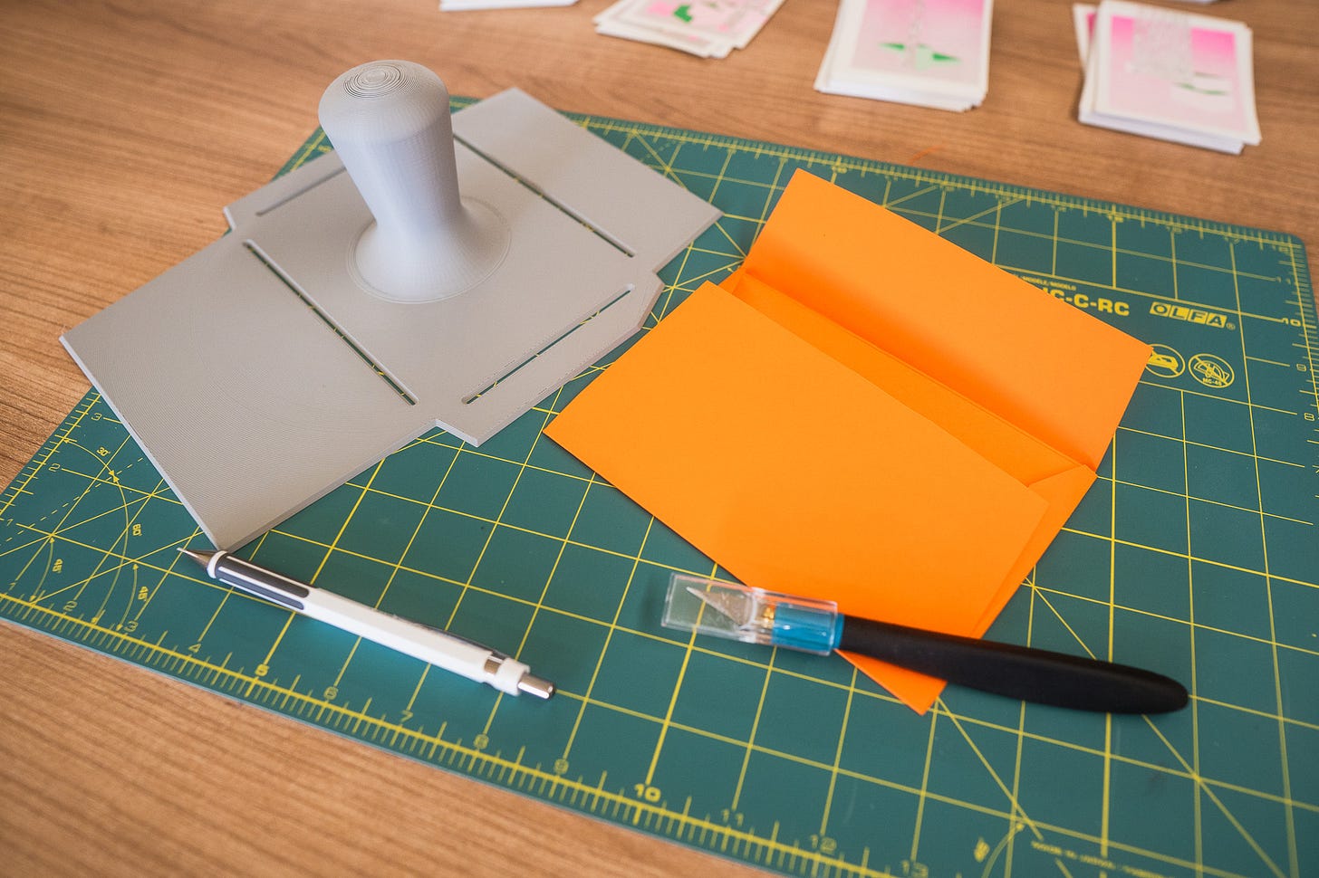 And because I canāt leave well enough alone, I made two more versions with an extra bit of utility; slots where you can sketch-in/see where the edges/folds of the envelope will be, and a very over the top handle which makes the whole thing easier to hold and move around, but harder to store in a draw.