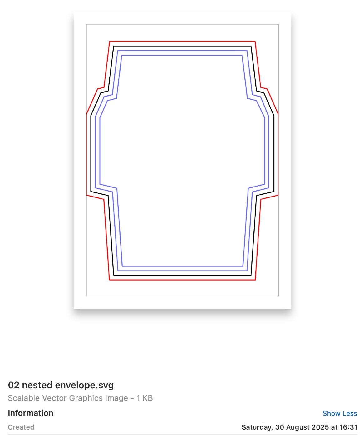 1 - Iāve included `02 nested envelope.svg/json` which has the normal envelope outline, one thatās expanded by 5mm, and two which are contracted by 5mm and 10mm - which gives you some wiggle room when figuring out how close to the edge of the envelope you want to get.