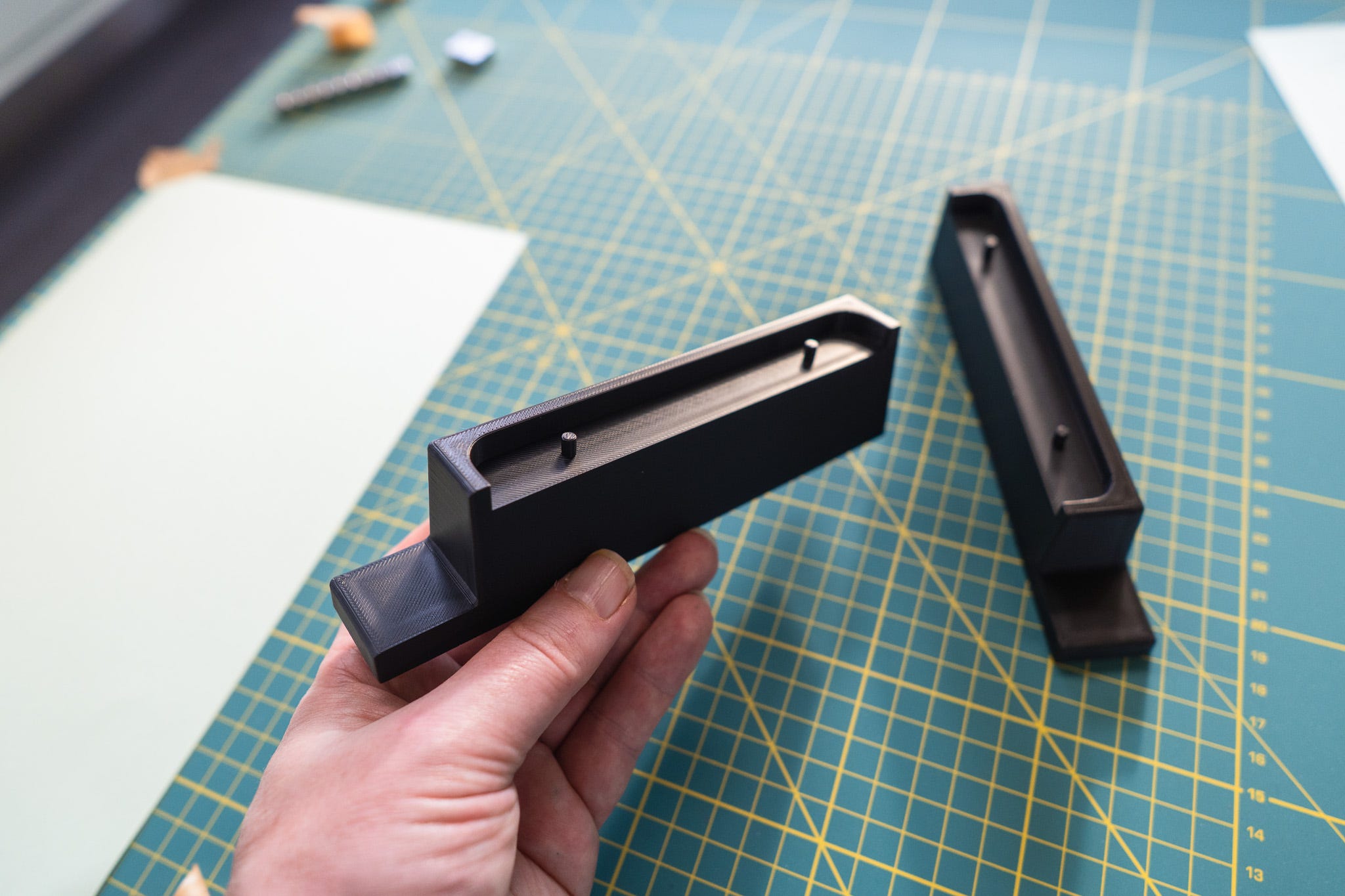 …the flat jutting out bit is so I can clamp them down to a table if needed. I also modelled and printed some “risers” which are 4mm high and “lock” into place with studs and holes, so I can stack as many as I need together (sticking rubber feet onto the lowest one).