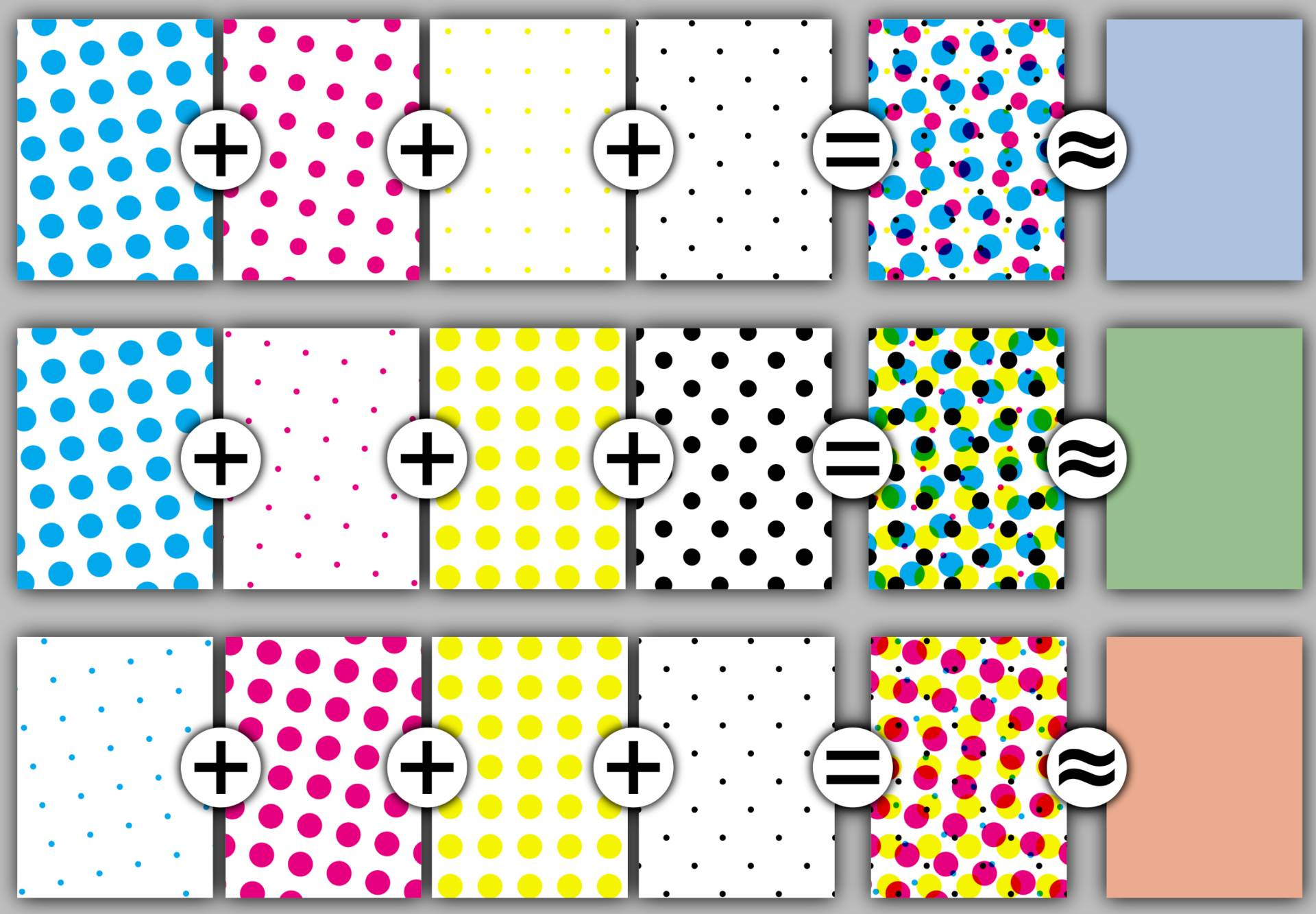 Basically you can create the appearance of shade by varying the size of dots on a grid, shown above a hexgrid. Below, mixing CYMK dots at various sizes to make different colours.
