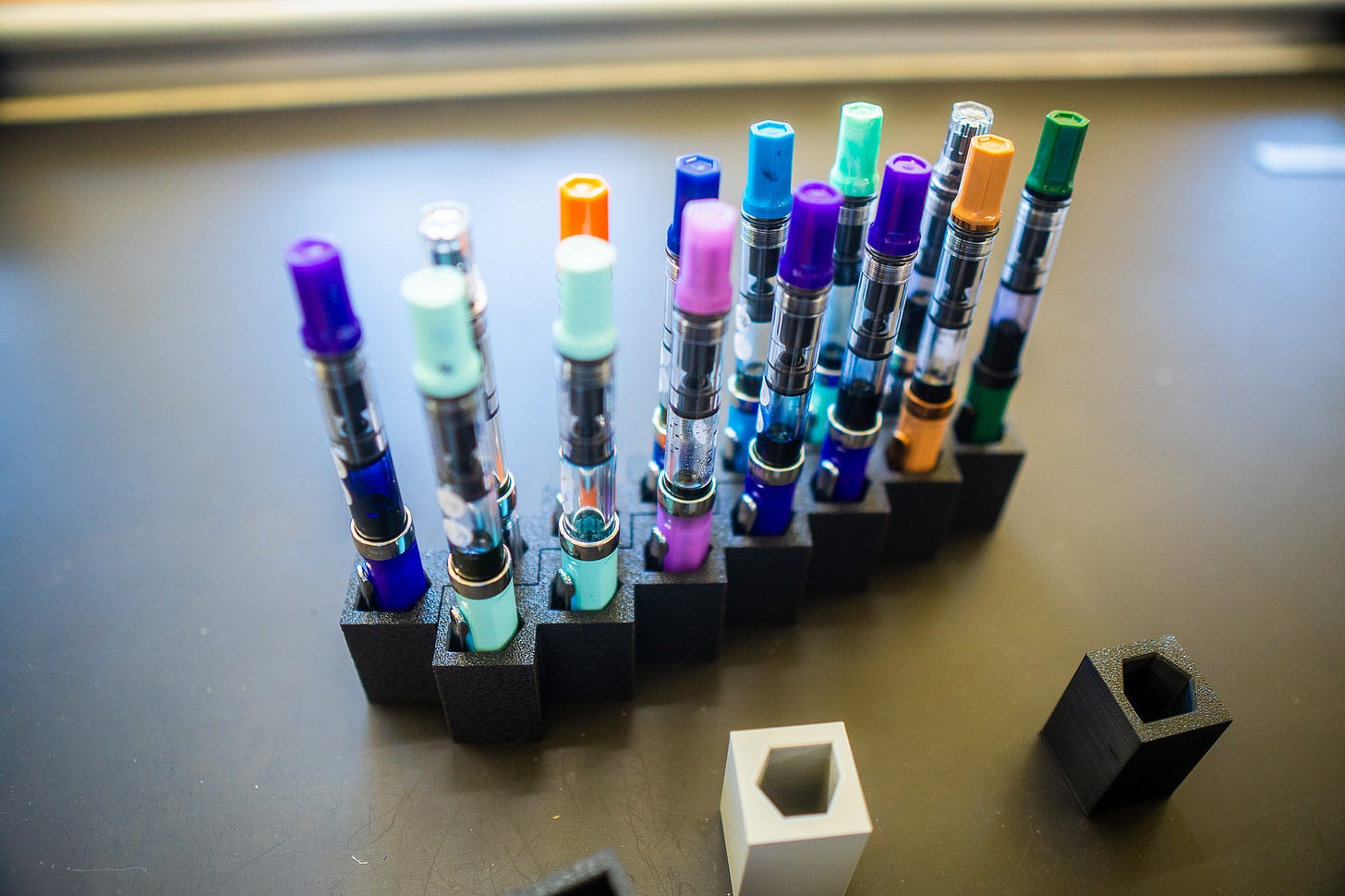 Well, apparently a side project of mine is making pen holders. Because I always have a lot of pens kicking around, and the most efficient way of keeping them ready to go while taking up minimal space is to store the vertically. Here’s some I made to hold TWSBI Eco pens.
