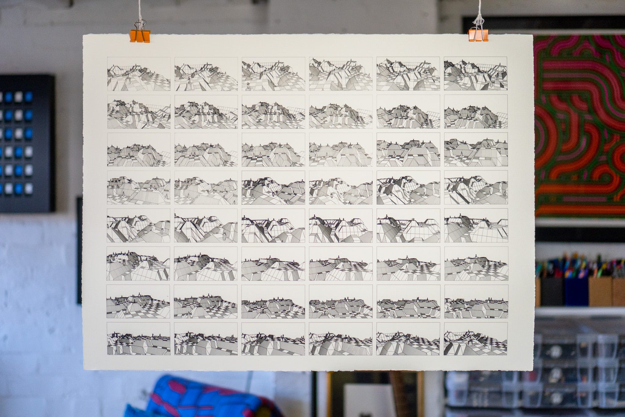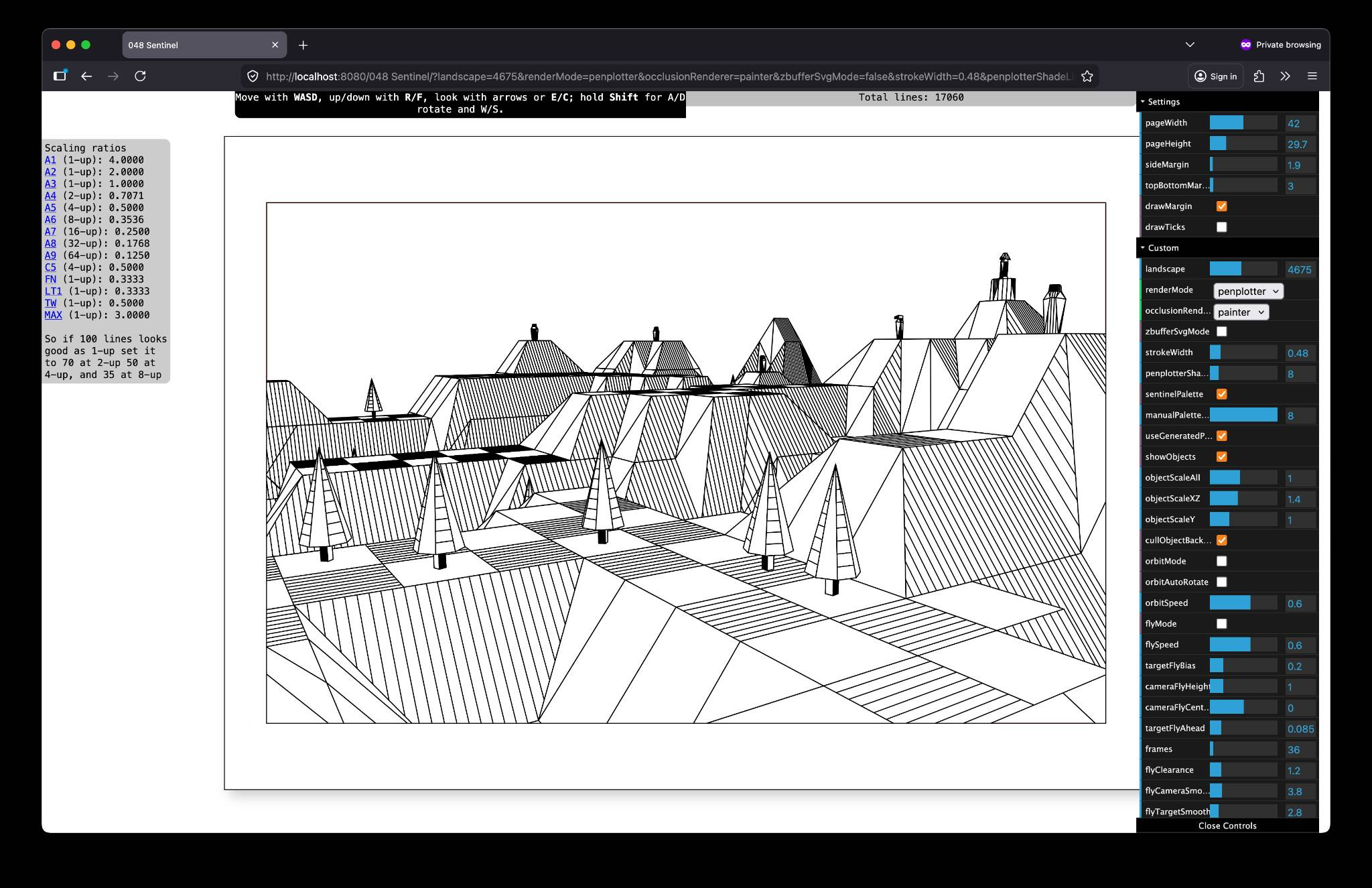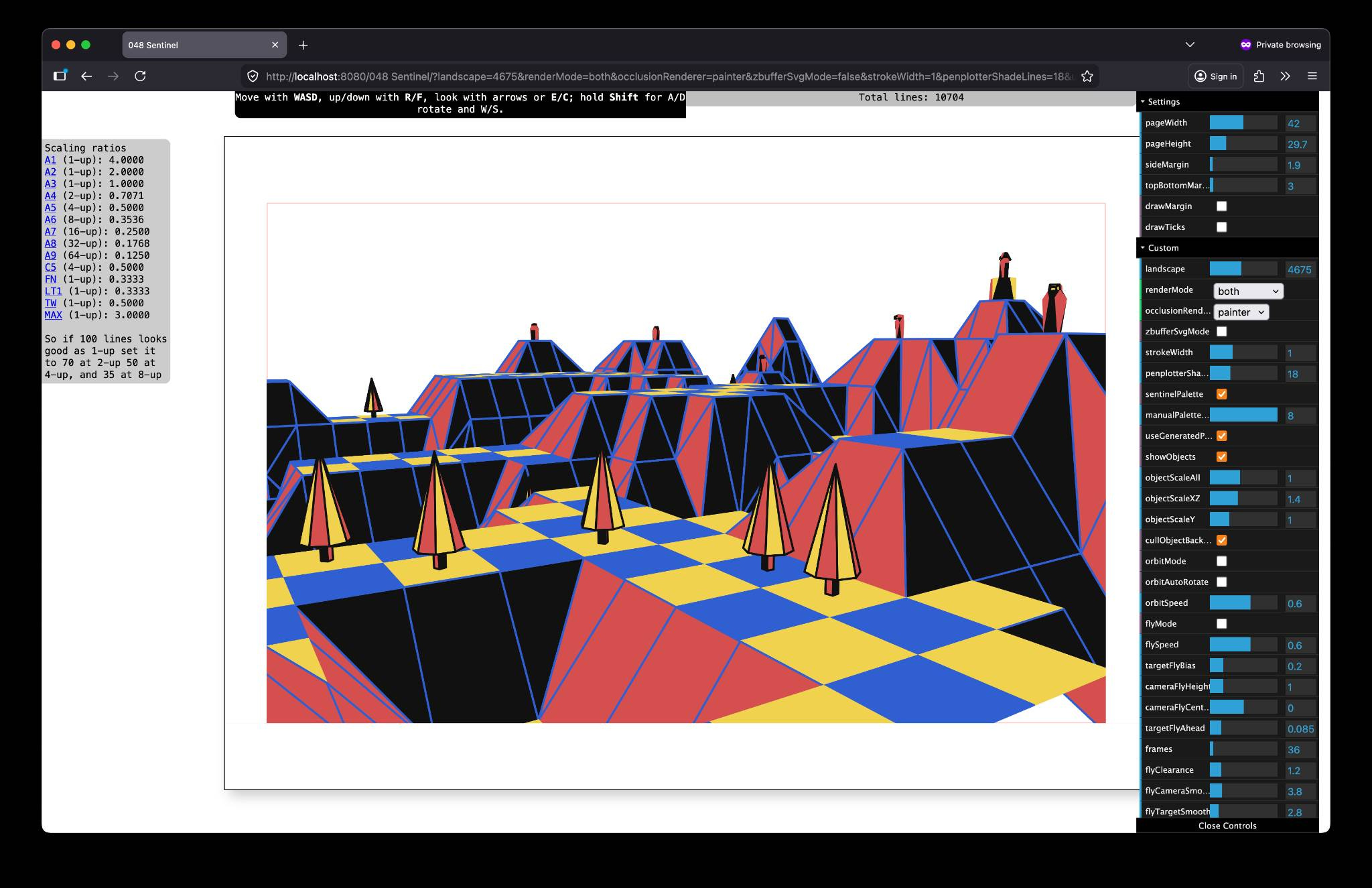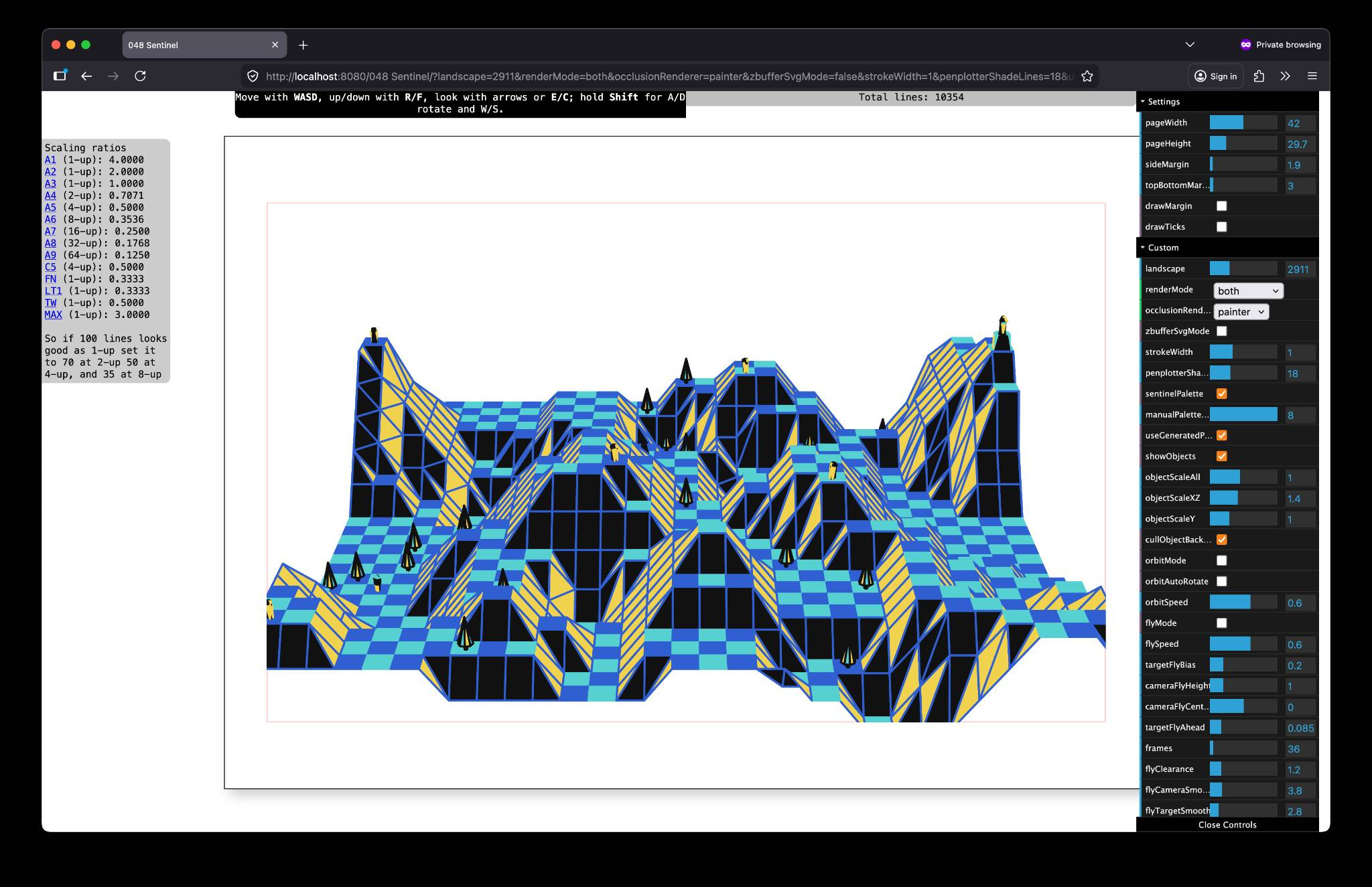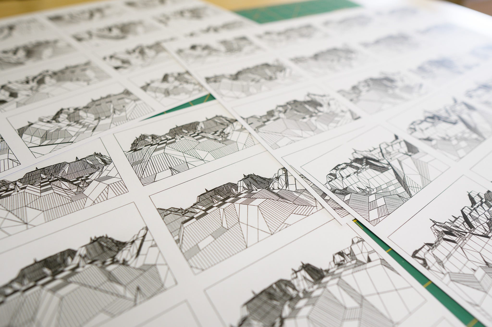 With all the pieces in place by the end of the holiday - picking landscapes from 1-9999, moving the “camera” to set up a shot, automating a looping fly-through or orbit; it didn’t take much to add in the ability to make it automatically export out X number of frame as SVG files from a loop, and scale them down to tile onto sheets of paper.